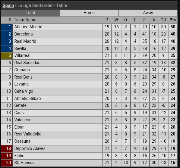 The following player statistics are available in the scorers table, for each top scorer: Find overall standings, laliga home/away tables, laliga 2020/2021 results/fixtures. Detailed info include goals scored, top scorers, over 2.5, fts, btts, corners, clean sheets. Follow laliga 2020/2021 and more than 5000 competitions on flashscore.co.uk! Follow live table & standings updates of the laliga on 365scores.